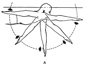 Рисунок 30, А, приведенный в разделе 2 главы 4, иллюстрирует нам, как чемпион Олимпийских игр 1964 г. Кевин Берри (а именно он изображен на этом рисунке) решил данные вопросы при плавании баттерфляем. И он, и другие пловцы-баттерфляисты мирового класса используют гребок руками, напоминающий по форме песочные часы или замочную скважину и позволяющий непрерывно опираться о невозмущенную массу воды. Они выполняют гребок не по прямым, а по криволинейным, эллиптическим траекториям. То же самое можно сказать и о спортсменах, плавающих кролем на спине, брассом и кролем на груди (см. рис. 30, Б, В, Г).