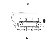 Б - гребная гусеница, напоминающая гребок пловца со сгибанием руки в локтевом суставе и в направлении строго спереди назад, который изображен на рис. 124, Б; это наименее эффективный движитель из всех трех;