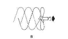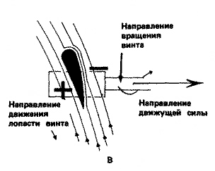 В - возникновение движущей силы на лопасти гребного винта судна: в связи с тем, что лопасти винта работают в вертикальной плоскости, гидродинамическая движущая сила толкает судно в горизонтальном направлении;