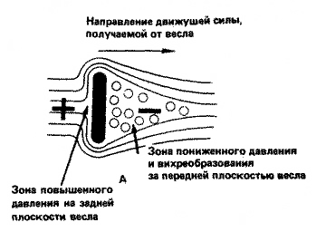 А - образование вихрей за задней плоскостью весла (движущая сила весла продвигает лодку в направлении вихревой дорожки);