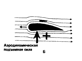 Б - картина обтекания воздушным потоком крыла самолета несимметричного профиля (с плавной выгнутостью верхней стороны профиля и чуть заметной вогнутостью нижней стороны): скорость воздушного потока над крылом возрастает, а давление падает, скорость воздушного потока под крылом уменьшается, а давление возрастает - в результате возникает аэродинамическая подъемная сила, направленная вверх;
