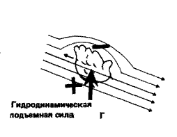 Например, подъемная сила, которая образуется на лопастях гребного винта судна, направлена вперед и двигает судно. Сходная картина возникает и во время винтообразных гребковых движений пловца - образующаяся на кисти подъемная сила направлена преимущественно также вперед.