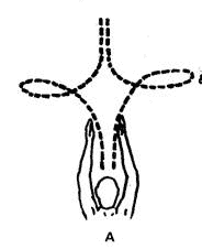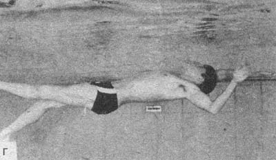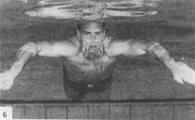 Характерные моменты положения рук и траектории движения кистей относительно неподвижной воды во время гребка брассом олимпийского чемпиона Дона Маккензи показаны на рис. 132. Можно видеть, как в начальной фазе гребка кисти, выполняя гребок кнаружи, продолжают все еще двигаться вперед (рис. 132, А). Вообще вся первая половина гребка протекает так, что кисти не сдвигаются относительно воды назад. Лишь когда руки выполняют скользящее гребковое движение внутрь (рис. 132, Б), кисти слегка уходят назад.