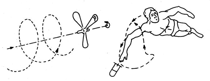 Где же оптимальное решение вопроса? Для судов таким решением оказалось применение гребного винта. Гребной винт судна всегда захватывает своими лопастями невозмущенную массу воды и никогда не отбрасывает ее строго назад. В каждый данный момент своего движения лопасть винта вступает в контакт с неподвижной водной средой. Аналогично работает и воздушный винт самолета. Моя точка зрения в отношении гребковых движений пловца тоже сводится к тому, что спортсмен не должен пытаться отталкивать воду строго назад. Более эффективными для него будут винтообразные гребковые движения кистями рук и стопами.
