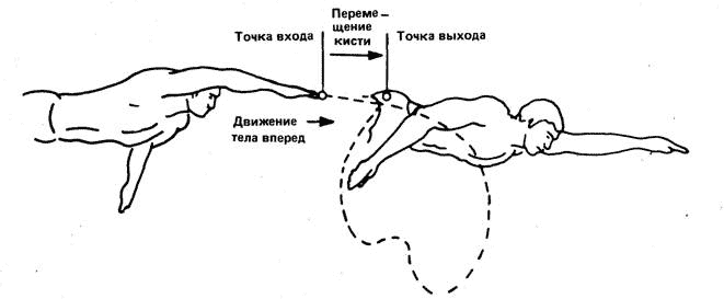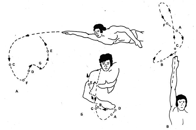 Рис. 30 Криволинейные траектории движений руки во время гребка при плавании: