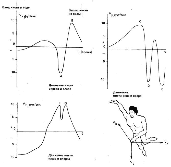 Несколько иную картину мы видим на графике скорости Vz при движениях кисти вперед и назад (см. рис. 138). Наивысшее значение скорости мы наблюдаем в начале графика, и оно обусловлено не столько рабочим движением самой руки (рука в это время скользит вперед), сколько высокой скоростью поступательного движения тела спортсмена вперед. Точка, в которой кривая скорости пересекает ось абсцисс, заслуживает особого внимания. На графиках скорости движения кисти слабоподготовленных пловцов эта точка находится ближе к началу координат; иными словами, эти пловцы достигают положительной скорости движения кисти (т.е. движения кисти в направлении назад) в гребковом цикле движений раньше, чем это показано на графике рис. 138. Дальнейшие изменения кривой скорости V демонстрируют нам два пика (точки F и G), которые соответствуют моментам изменения направления в движениях кисти.