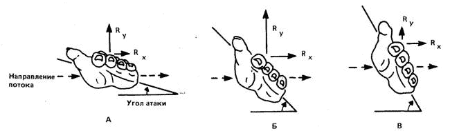 Наибольшие величины подъемной силы наблюдаются при угле атаки близком к критическому (рис. 139, Б). При больших или меньших углах атаки величина подъемной силы уменьшается. Например, когда угол атаки крыла самолета превышает критический, отмечается так называемый срыв плавного обтекания крыла. В аналогичных случаях при плавании кисть руки начинает взаимодействовать с водой не как лопасть гребного винта, а как весло каноэ (рис. 139, В). При слишком малом угле атаки и подъемная сила Rу, и сила лобового сопротивления уменьшаются - кисть начинает скользить по потоку, эффективность гребка падает (рис. 139, А). Как видим, чтобы получить наибольшую величину подъемной силы, пловцу приходится тонко регулировать положение кисти в потоке воды, а сделать это он может лишь на основе "чувства воды".