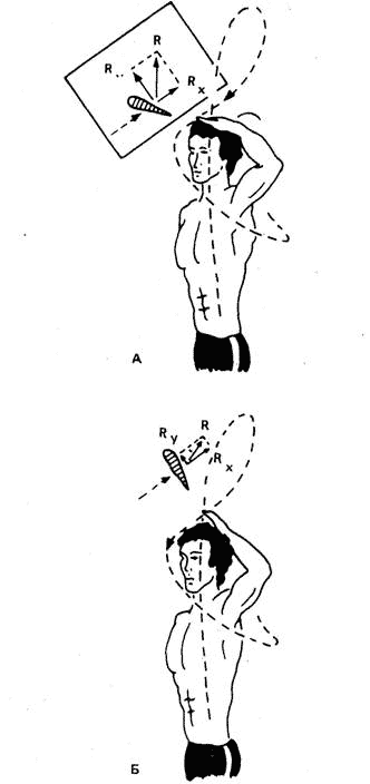 Рисунок 140, А иллюстрирует нам образование силы тяги при правильном положении кисти во время диагонального гребкового движения рукой. В рассматриваемом случае кисть ориентирована к траектории своего движения под острым углом, а направление равнодействующей силы реакции воды R совпадает с направлением продвижения пловца вперед. Когда же кисть ориентирована к траектории своего диагонального движения под заметно большим углом, равнодействующая сила R направлена в сторону (рис. 140, Б) и, как правило, вызывает ненужные боковые движения бедер пловца.