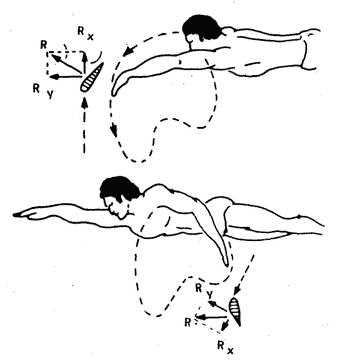 Сходную картину мы можем наблюдать и во время движения кисти руки пловца в воде, если она ориентирована под правильным углом к траектории своего движения, В этом случае кисть взаимодействует с потоком воды подобно лопасти винта, и на ней возникают силы, направленные в сторону продвижения пловца.