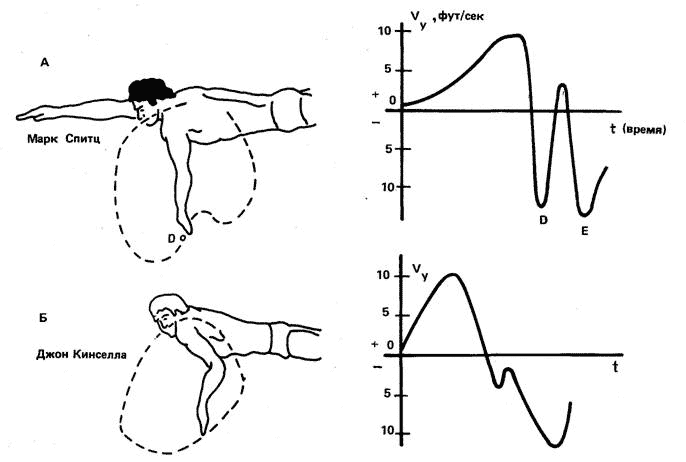 Становится очевидным: в шестиударном кроле спортсмен может в середине гребка выполнить движение кистью из стороны в сторону или вниз-вверх с высокой скоростью именно в связи с тем, что в этой фазе цикла появляются от движений ногами вредные вертикальные и боковые силы. На нейтрализацию этих вредных сил и уходит часть полезных сил, возникающих на кисти, в частности сила лобового сопротивления. Подъемная сила, которая достигает своего максимума за счет резко возросшей скорости кисти, продолжает служить продвижению пловца вперед. Например, на графике скорости движения кисти Уу во время гребка рукой Марка Спитца в шестиударном кроле (рис. 143, А) мы отмечаем в точке D резкое ускорение движения кисти. Оно, как можно считать с достаточной уверенностью, вызывает уменьшение амплитуды движений ногами, так как в этот момент цикла движений отпадает необходимость в сильном ударе ногой вниз. У другого пловца, Джона Кинселлы, который плавает двухударным кролем, такого скользящего движения кисти вверх мы не отмечаем (рис. 143, Б).