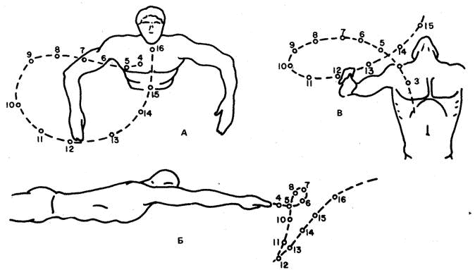 Траектория движения кисти пловца в горизонтальной плоскости (рис. 144, В) построена на основе анализа кадров кинопленки, отснятой оператором со дна бассейна кинокамерой, направленной объективом строго вверх. Проплывавший над кинооператором спортсмен попадал в поле зрения камеры, и положения его кистей во время гребка руками фиксировались на кинопленке именно в той последовательности, которую мы видим на рисунке (обозначенная цифрой точка траектории кисти соответствует ее положению в определенном кинокадре). Отметим, что взгляд на пловца снизу хорошо выявляет винтообразный характер гребка руками при плавании брассом. Кисть спортсмена выполняет рабочие движения преимущественно из стороны в сторону: кисть нажимает на воду в точках 3-10, затем скользит внутрь в точках 10-15. Назад она смещается незначительно (в точках 6-11). Мы можем сказать также, что во время гребка (от точки 3 до точки 15) кисть перемещается в направлении вперед. И этот факт развенчивает теории, утверждающие, что во время гребка руками при плавании брассом вода отталкивается в направлении назад.