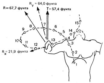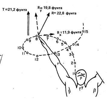 Увеличенная длина гребка руками пловца № 2 (рис. 149, А) обусловливала менее эффективную траекторию движения кисти во второй половине гребка (рис. 149, Б, точки траектории 12-15). В результате равнодействующая сила R, равная по величине 25,5 фунта, отклонилась в сторону (кнаружи) слишком сильно, что вызвало уменьшение силы тяги T (равна всего лишь 10 фунтам). Гребок оказался явно неэффективным.