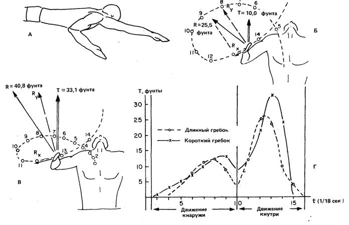 Анализируя рис. 149, Б и 149, В, следует обратить внимание на то, что при одном и том же положении руки во время длинного и короткого гребка направление равнодействующей силы R, образующейся на кисти, во втором случае в большей мере приближается к направлению продвижения пловца вперед. Вследствие этого резко возрастает сила тяги Т (равна 33,1 фунта). Большой прирост силы тяги становится возможным благодаря не только изменившейся форме траектории движения кисти, но и тому, что пик скорости этого движения возникает на коротком гребке немного позднее, ближе к точке 13 траектории (см. рис. 149, В), чем при длинном.