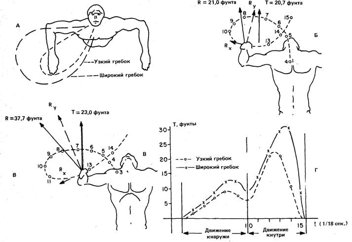 А - амплитуда движений кисти во время узкого и широкого гребков; Б -траектория движения кисти и сила тяги при узком гребке; В - траектория движения кисти и сила тяги при широком гребке, Г - график силы тяги при узком и широком гребках
