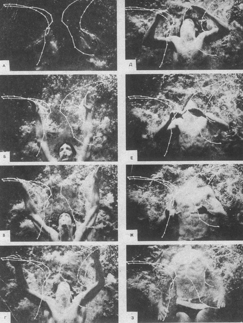 показаны на рис. 30, А. Подобным гребком, напоминающим по форме песочные часы, пользовались (с небольшими отличиями) все пловцы-баттерфляисты мирового класса, включая Гари Холла, Аду Кок, Марка Спитца. Траектория движения кистей рук пловца на рис. 30. А построена относительно тела спортсмена. Траекторию движения кистей относительно неподвижной воды при плавании баттерфляем можно увидеть на подводной кинограмме движений олимпийского чемпиона Чарльза Хиккокса (рис. 127). Движения были засняты 35-миллиметровой кинокамерой, установленной неподвижно на дне бассейна, в тот момент, когда спортсмен проплывал как раз над камерой. Частота киносъемки 24 кадра в 1 сек. Весь гребок (с момента, когда кисти рук вошли в воду, и до момента, когда они покинули ее) вместился в 25 кадров и занял по времени 1 сек. или чуть больше. На рис. 127 показаны лишь отдельные кадры, на которых запечатлены наиболее характерные моменты движений рук пловца (порядковый номер кадра указан на рисунке в скобках рядом с буквенным обозначением кадра; за кадр 1 принят момент входа кистей в воду).