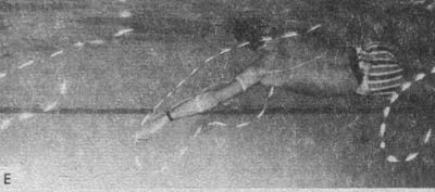 тела пловца. Истинная траектория движения кисти относительно неподвижной воды была зафиксирована на фотопленке при съемке спортсмена, когда он плыл в затемненном бассейне с пульсирующим источником света (20 вспышек в 1 сек.), закрепленным на среднем пальце каждой руки (см. пунктирную световую линию на рис. 130, Е). Однократная яркая общая вспышка света позволила запечатлеть на той же фотопленке и фигуру пловца. Хочу обратить внимание читателя на, то, что на последнем рисунке кисть спортсмена покидает воду после гребка несколько впереди точки своего входа в воду в начале гребка.