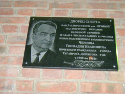 Мемориальная доска на стене Дворца спорта: Дворец спорта ОАО "Таганрогского з-да "Прибой" был построен методом народной стройки и сдан в эксплуатацию в 1961 г. под непосредственным руководством Чернова Геннадия Ивановича, почетного гражданина города Таганрога, директора з-да с 1950 по 1961 г.