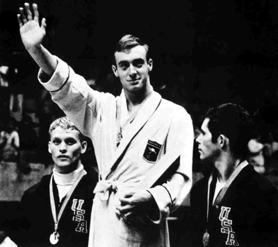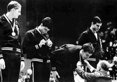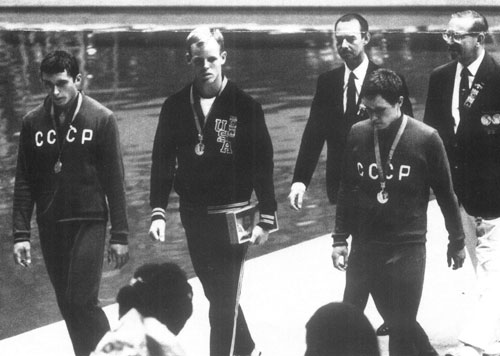 Призеры на 100 м брассом: Н.Панкин (СССР), Д.Мак-Кензи (США), В.Косинский (СССР)
