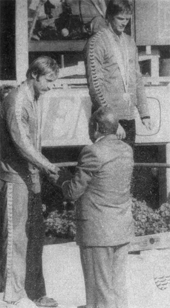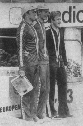 В комплексном плавании на 400 м золотую и серебряную медали получают а Йёнчепинге советские спортсмены Сергей Фесенко (а центре) и Андрей Смирнов (слева). Справа - бронзовый призер чемпионата С. Шош