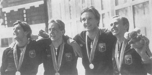 Сильнейшие пловцы на 100 м баттерфляем: в центре Пэр Арвидссон (Швеция), слева Рогер Пыттель (ГДР), справа Дэвид Лопес (Испания)