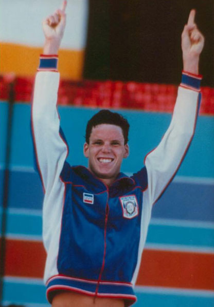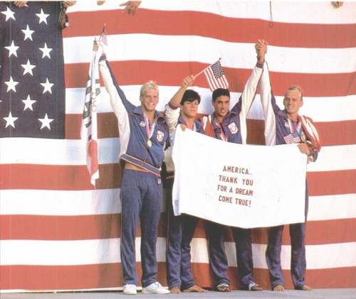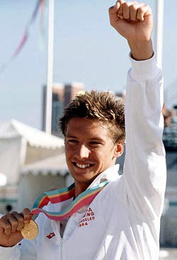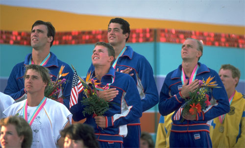 4 x 200 м вольный стиль: мировой рекорд: 7.20,40 (ФРГ, 23.08.1983); олимпийский рекорд 7.23,22 (США, 1976). Квалификационные заплывы и финал 30 июля. 14 команд, 2 заплыва. Квартет Западной Германии произвел сенсацию на Чемпионате Европы в Риме в 1983 году, отобрав мировой рекорд у американцев в этом самом престижном виде олимпийской программы. После 1960 года лишь Япония в 1963 и Австралия в 1970 годах осмеливались покуситься на эту американскую вотчину, да и то, американцы почти сразу же возвращали себе достижение. В квалификационном заплыве у американцев плывут двое «запасных», вместо отдыхающих перед финалом Хитом и Флоатом. И один из этих «запасных» - Габерино - на первом этапе показывает время 1.49,60 – с этим результатом днем раньше он бы мог заработать бронзовую медаль! Его поддержали остальные члены команды: Ларсон – 1.50,38, Хейс - 1.50,04 и еще один «запасной» - Рик Зегер - 1.48,85 (причем лучшие результаты показала вроде бы более «слабая» часть команды). В итоге – 7.18,87 – американцы не самым сильным составом возвращают себе мировой рекорд. Немецкая же команда без Михаэля Гросса вышла в финал второй - 7.25,29. При том, что конечная цель у обеих команд одна – победа, тактика у них противоположная. С одной стороны, три первых немецких пловца будут пытаться не отстать от своих соперников, чтобы создавшийся отрыв мог ликвидировать их лидер. Их соперники, наоборот, должны создать на первых трех этапах достаточное преимущество, чтобы плывущий на заключительном этапе Брюс Хейес смог выдержать напор Гросса. Серебряный призер на этой дистанции Хит на первом этапе (1.48,67) значительно опережает своего соперника Фарнера (1.49,83). На втором этапе Кортальс (1.48,75) немного отыгрывает у Ларсона (1.49,01) - отрыв американцев - 90 сотых. На третьем этапе специалисту на 400 и 1500 Флоату противостоит «слабое звено» немецкой команды Алекс Шовтка: 1.49,60 против 1.50,26 у немца. Перед последним этапом разрыв 1,56 секунды, притом, что в финале Гросс у серебряного медалиста выиграл 1,66 сек. Феноменально стартовав (51,90) Гросс буквально сел на ноги Хейесу (53,19) и на второй сотне сравнялся с американцем. Однако Брюс Хейес был поставлен на последний этап именно за свои бойцовские качества! Весь последний «полтинник» «маленький» американец (рост 183 см против 200 см у немца) не дает себя в обиду и бортика спортсмены касаются вместе. Победителя смогла определить только электроника – команда США выиграла четыре сотых! Феноменальной скорости Гросса (1.46,89) не хватило, чтобы обогнать прыгнувшего выше головы Хейеса (1.48,41) Улучшив утренний рекорд больше, чем на три секунды - 7.15,69 американцы становятся чемпионами. У их соперников 7.15,73. Драматическая борьба между двумя первыми квартетами почти заставила забыть о других финалистах. Неожиданно бронзовые медали достаются команде Великобритании – 7.24,78.