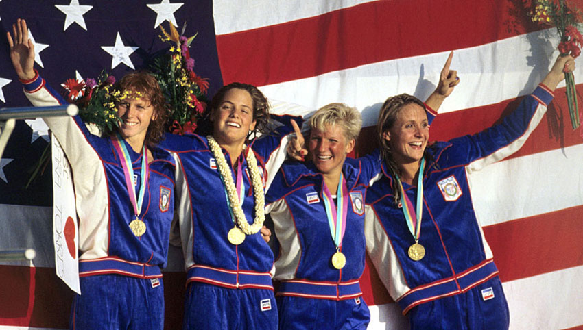 4 x 100 м вольный стиль: мировой и олимпийский рекорды 3.42,71 (ГДР, 1980). Квалификационные заплывы и финал 31 июля. 12 команд, 2 заплыва. Казалось бы, в отсутствие команды ГДР никто не сможет составить конкуренцию американкам. Однако, борьба в финале заставила вспомнить драматический финиш этой эстафеты в Монреале в 1976 году. Голландка Верстаппен на первом этапе (55,94) обгоняет американку Джонсон (56,46) и австралийку Пирсон (56,51). С этого момента борьба за «золото» будет сосредоточена практически только между квартетами США и Нидерландов. На втором этапе одна из чемпионок – Стейнзифер (55,87) – обгоняет Воскес (56,77) и выводит свою команду на 38 сотых вперед. К всеобщему удивлению, голландка Рейерс (55,62) ликвидирует разрыв и всего на восемь сотых отстает от Дары Торрес (55,92). Но у американок на финишном этапе еще одна чемпионка – Нэнси Хогсхед! Она великолепно проходит свой отрезок (55,18) и лишает Конни ван Бентум (56,07) надежды на «золото». У американок - 3.43,43, у голландок - 3.44,40. На последнем этапе немка Карин Зайк (55,74) пыталась добыть «серебро», но слишком велик был отрыв – команда ФРГ на третьем месте - 3.45,56, опередив австралиек – 3.47,79. 100 м на спине: мировой и олимпийский рекорд 1.00,86 (Р. Райниш (ГДР), 1980). Квалификационные заплывы и финалы 31 июля. 31 участница, 4 заплыва. Обладательницы лучших результатов сезона румынки Кармен Буначиу (1.02,01) и Анка Патрашкоу (1.02,18) в квалификации показывают соответственно 1.03,79 и 1.04,16 и уступают американкам. У всех финалисток шансы приблизительно равны. Буначиу стремится доказать, что в отсутствие спортсменок ГДР ей нет равных, но от нее не отстает голландка де Ровер – на 50 м обе лидируют – (30,17). Далее следуют американки Бетси Митчелл (30,50) и Тереза Эндрюс (30,56) и Патрашкоу (30,70). 35 метров до финиша – американки настигли лидеров и все плывут вместе. 20 метров до финиша – румынка начинает отставать. Касание – Эндрюс на восемь сотых опережает подругу по команде (1.02,5 и 1.02,63), оставляя де Ровер на третьем месте – 1.02,91. Буначиу (1.03,21) и Патрашкоу (1.03,29) не смогли использовать свой шанс. Хотя им достаточно было повторения своего лучшего результата…