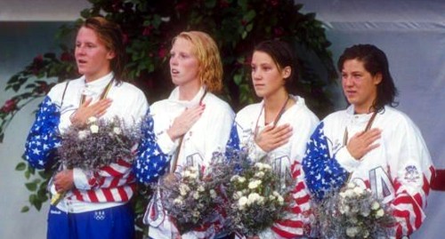 4 x 100 м комбинированная: мировой рекорд 4.03,69 установлен квартетом ГДР 24 августа 1984 года в Москве; олимпийский рекорд 4.03,74 установлен другой четверкой из ГДР в Сеуле. Квалификационные заплывы и финал 31 июля. 17 команд разбиты на 3 заплыва. В отсутствие команды ГДР трудно представить, кто может составить конкуренцию американкам. В финале в отсутствие двух лучших спинисток Олимпиады – венгерок Эгершеги и Сабо, бронзовый призер американка Ловлес стартует с опережением графика мирового рекорда – 29,55, и хотя на обратном пути ее скорость падает, результат все равно великолепный - 1.00,82. Вторая – немка Хазе 1.01,61, следом австралийка Ливингстон - 1.02,09, Нина Живаневская из команды СНГ - 1.02,54 и китаянка Лин Ли - 1.02,90. Великолепная сотня брассом - 1.07,44 Елены Рудковской позволяет «объединенной команде» выйти на второе место, отставая от американок на полсекунды. Но на последних двух этапах Аман-Лейтон (58,58) и Томпсон (54,47) уводят свою команду в отрыв и финишируют в одиночестве - 4.02,54 – мировой рекорд. В борьбе за второе место юная немка Ван Альсмик на баттерфляе (59,08) выводит свою команду вперед, на четвертом месте, благодаря усилиям чемпионки Цянь (58,97) – китаянки. На финише Хунгер без проблем (55,07) удерживает свою команду на втором месте - 4.05.19, а Наталья Мещерякова (55,48) выдерживает натиск китаянок (55,40) и обеспечивает своей команде «бронзу».