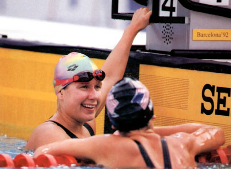 200 м брасс: мировой рекорд 2.25,35 установлен Анитой Нэлл (США) 2 марта 1992 года в Индианаполисе; олимпийский рекорд 2.26, 71 установлен Силке Хёрнер (ГДР) в Сеуле. Квалификационные заплывы и финал 27 июля. 39 участниц разделены на 5 заплывов. В отсутствие чемпионки Хёрнер, фаворитом является мировая рекордсменка Нэлл. В финале Нэлл стартует по графику собственного мирового рекорда – 33,15. Остальные заметно отстают: канадка Клутье – 34,00 ; Рудковская – 34,26; китаянка Лин Ли – 34,55, японка Киоко Ивасаки – 34,68. На середине дистанции американка увеличивает отрыв – 1.10,13, на шесть сотых опережая график рекорда. Подтягивается к лидерам Ивасаки – она уже третья (1.11,81) после Клутье (1.11,43). Три четверти дистанции: Нэлл сохраняет существенный отрыв от второго номера, которым уже является Ивасаки - 1.48,57 и 1.49,55. Чуть-чуть отстает Ли - 1,49,70. Остальные уже выбыли из борьбы за медали. На последней четверти разрыв между лидерами сокращается и последние 15 метров тройка плывет вровень. Все три пловчихи касаются бортика практически одновременно. Удача на стороне Ивасаки - 2.26,65 – новый олимпийский рекорд. Вторая Ли – 2.26,85 - она опередила Нэлл всего лишь на три сотые! Один из самых больших сюрпризов Игр. Ивасаки в воде, кажется, еще не верит своей победе. Только позже, на пьедестале почета, она все осознает и не может, или не хочет, сдержать слез. Вместе с ней на трибунах плачет от счастья ее мама. Ивасаки стала самой молодой олимпийской чемпионкой в плавании - 14 лет и 7 дней, «свергнув» с пьедестала Крастину Эгершеги, которой в Сеуле было «целых» 14 лет, 1 месяц и 9 дней . 100 м баттерфляй: мировой рекорд 57,93 установлен Мэри Т. Мигер (США) 16 августа 1981 года в Милуоки; олимпийский рекорд 59,00 установлен Кристин Отто (ГДР) в Сеуле. Квалификационные заплывы и финал 29 июля. 49 участниц разделены на 7 заплывов. Фаворитами являются чемпионка мира в Перте-91 китаянка Хун Цянь, другая китаянка Ван, американка Крисси Аман-Лейтон, француженка Катрин Плевински. В квалификации лучшее время у китаянок: только они «выплыли» из одной минуты (59,34 у Ван и 59,37 у Цянь). В финале Аман-Лейтон начинает быстрее, чем в свое время Мигер – 27,50! За ней Ван – 27,81 и Цянь – 27,83, а Плевински четвертая – 27,88. После поворота американка начинает медленно «сдавать», пока к 80 метра полностью не растеряла преимущество. Последним усилием Цянь вырывает победу - 58,62 - олимпийский рекорд. Аман-Лейтон вторая – 58,74. Плевински чуть-чуть не хватает, чтобы ее догнать – 59,01, и тут же финиширует китаянка Ван - 59,10. Эта же четверка была первой и год назад на чемпионате мира в Перте, правда, немного в другом порядке.