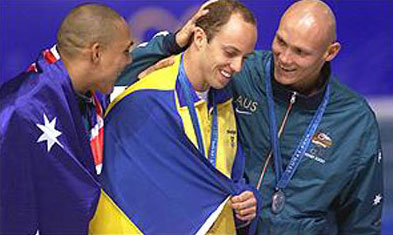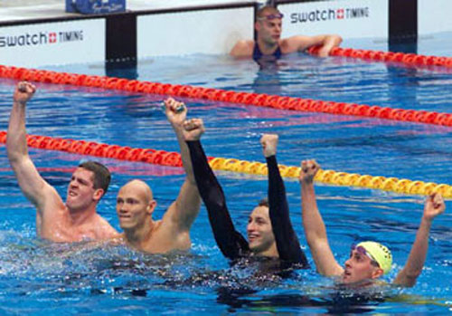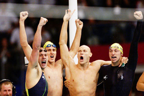 Австралийцы - чемпионы в эстафете 4х200 м вольным стилем: Э.Каллус, К.Фидлер, М.Клим,И.Торп
