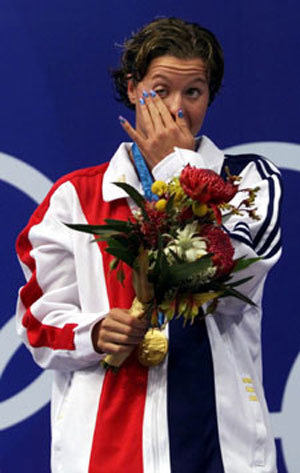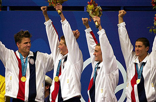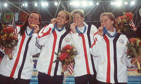 Команда США - чемпионки в эстафете 4х100 вольным стилем: Э.ван Дикен, Д.Торрес, К.Шели, Дж.Томпсон