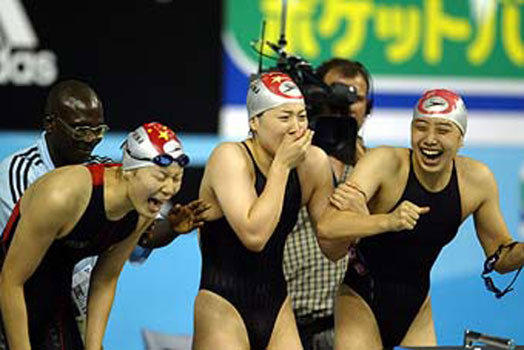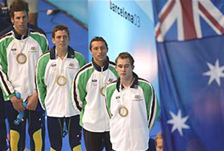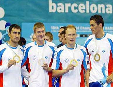 Чемпионы в эстафете 4х100 м вольным стилем: А.Капралов, И.Усов, Д.Пиманков, А.Попов (Россия)
