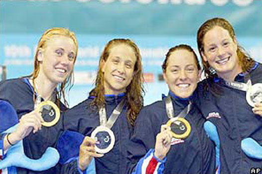 Команда США - чемпионки в эстафете 4х200 м вольным стилем: Л.Бенко, Р.Комисарц, Дж.Рианон, Д.Мунц