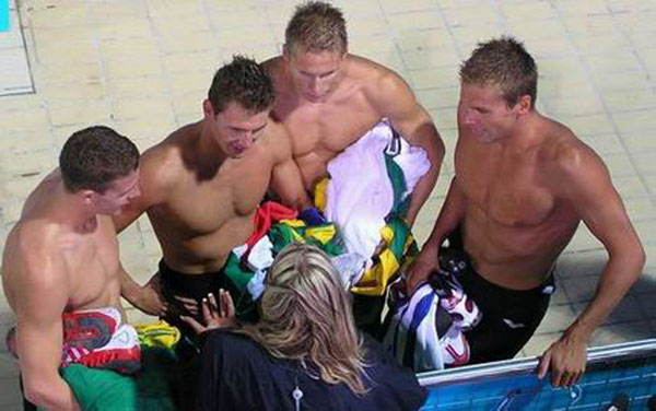 Южноафриканцы - чемпионы в эстафете 4х100 м вольным стилем: Р.Нитлинг, Л.Фернс, Р.Шуман, Д.Таунсенд