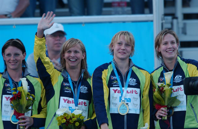 Команда Австралии - чемпионки в эстафете 4х100 м вольным стилем: Л.Лентон, Дж.Хенри, Э.Миллс, Ш.Рис