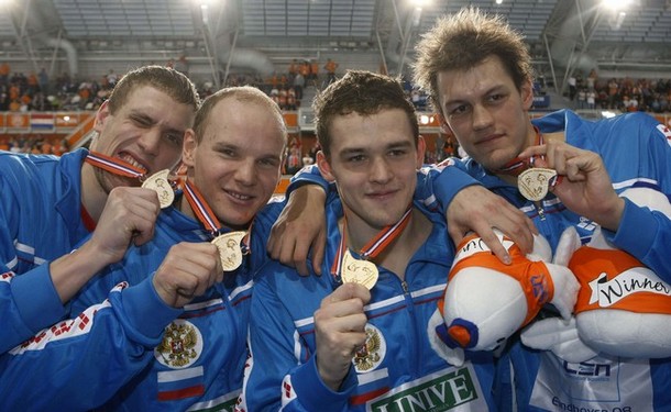 Команда России - чемпионы в комбинированной эстафете: А.Вятчанин, Г.Фалько, Е.Коротышкин, А.Гречин