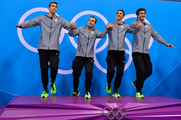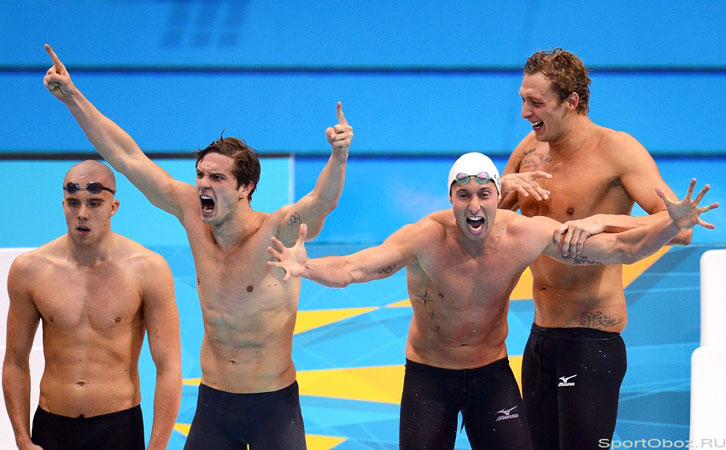 Команда США - чемпионы в комбинированной эстафете; М.Греверс, Б.Хансен, М.Фелпс, Н.Эдриан