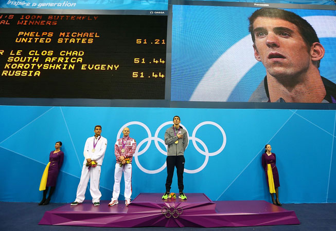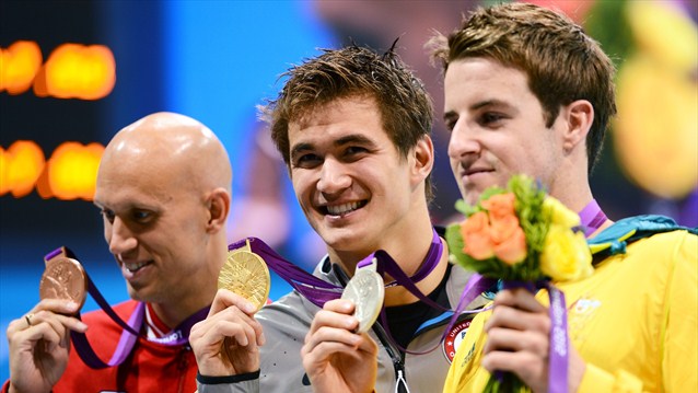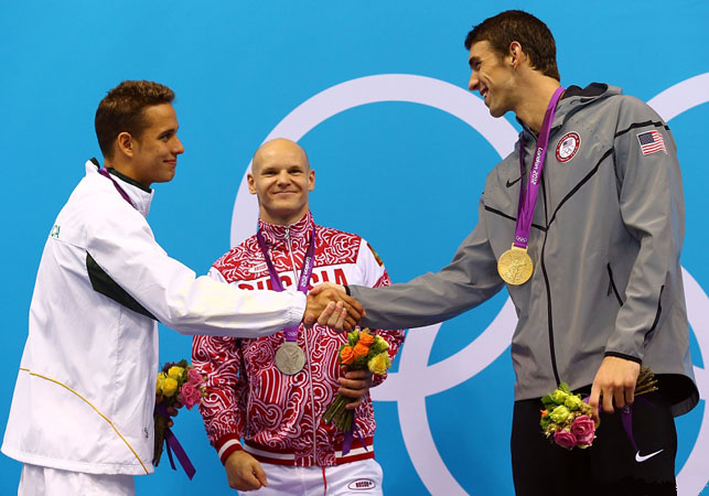 100 м баттерфляй: Ч.Ле Кло (Южная Африка), Е.Коротышкин (Россия), М.Фелпс (США)