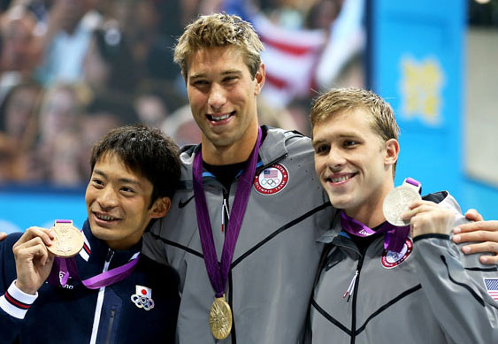 200 м баттерфляй: Т.Матсуда (Япония), Ч.Ле Кло (Южная Африка), М.Фелпс (США)