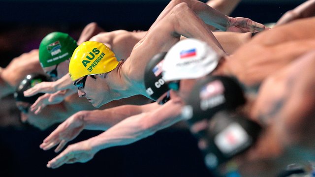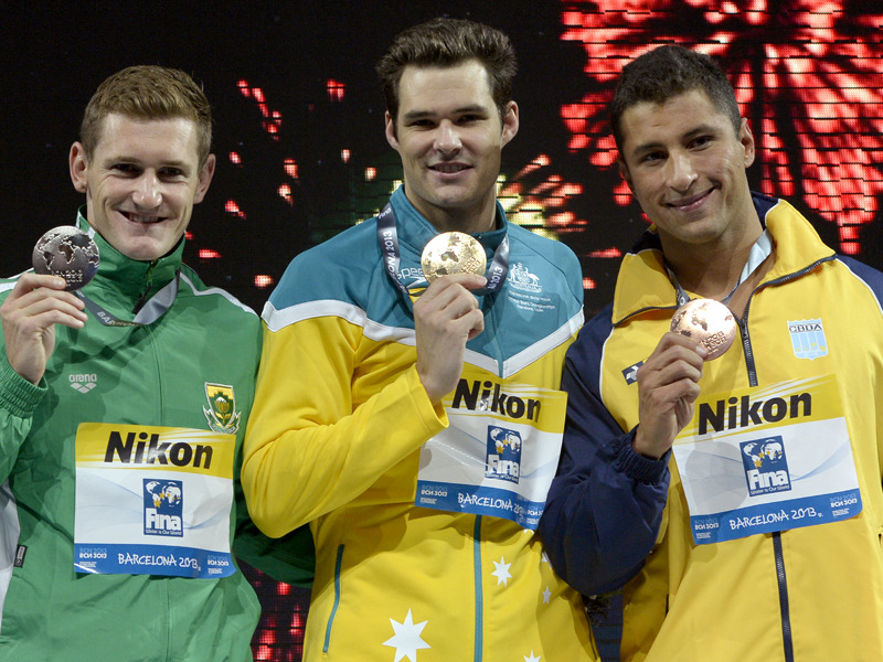 100 м брасс: К.Ван Дер Бург (Южная Африка), К.Спренгер (Австралия), Ф.Лима (Бразилия)